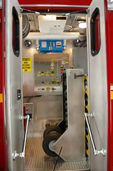 16′ Equipment Body, 6 compartments and refill station. SCBA cylinder sequencer, totally enclosed fragmentation station, 28 bottle SCBA cylinder storage, Kussmaul pump, 2 Wilburt Night Scan light towers, all compartments have LED lights and ROM roll-up doors.